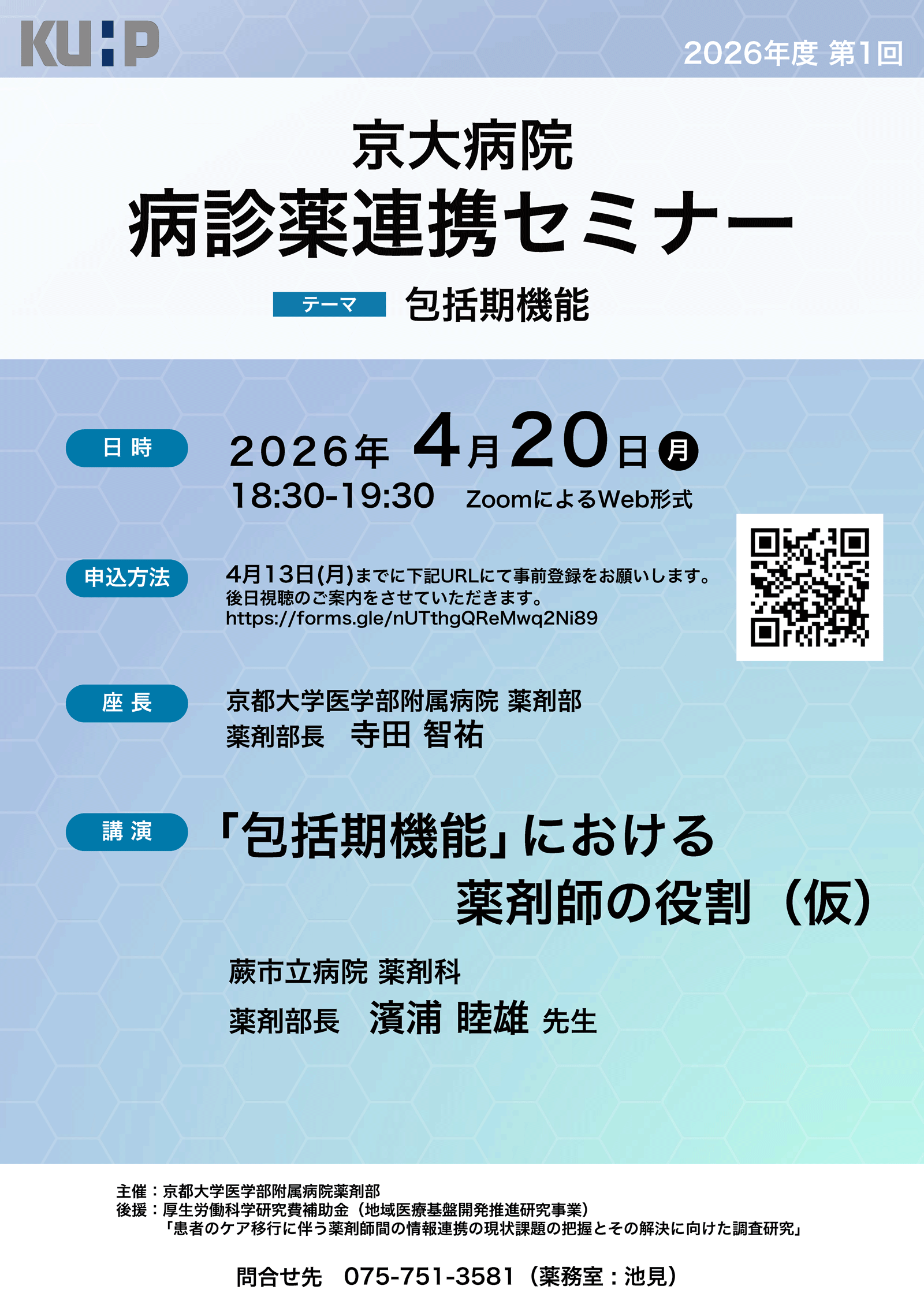 2026年4月20日(月)開催の2026年度第1回京大病院病診薬連携セミナーのご案内です。